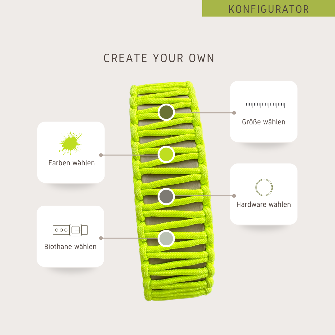 Stell dir dein individuelles Biothane x Paracordhalsband ganz nach deinem Geschmack zusammen. Wähle aus hochwertigen Biothane- und Paracord-Materialien sowie passender Hardware, um ein einzigartiges und langlebiges Halsband zu kreieren. So erhält dein Hund nicht nur ein stylisches Accessoire, sondern auch ein robustes und komfortables Begleiter für jeden Tag. Viel Freude beim Gestalten deines ganz persönlichen Lieblingsstücks!