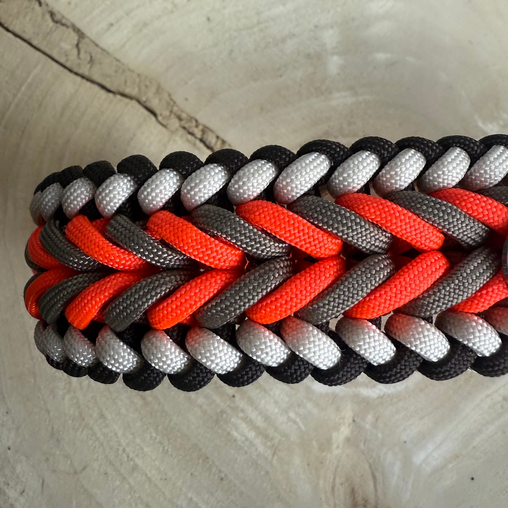 - Hohe Reißfestigkeit: Paracord besteht aus einem Kern aus mehreren miteinander verflochtenen Nylonfäden, umgeben von einer robusten Ummantelung. Dieses Material ist bekannt für seine außergewöhnliche Belastbarkeit und hält selbst starken Zugkräften stand, was es ideal für Hundeleinen macht.