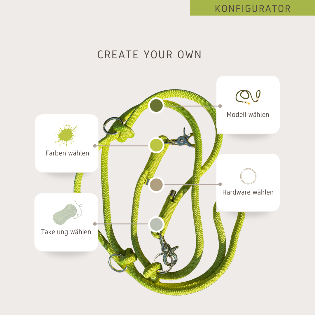 Mit unserer Seilleine kannst du deine ganz persönliche Leine gestalten – genau so, wie es für euch beide am besten passt. Wähle Länge, Farbe und Details, die zu deinem Hund passen, und genieße so maximale Flexibilität und Komfort beim Spaziergang. Die robuste Verarbeitung sorgt für Sicherheit und Langlebigkeit, damit ihr eure gemeinsame Zeit sorgenfrei verbringen könnt. So wird jede Gassi-Runde zum entspannten Erlebnis für dich und deinen Vierbeiner.